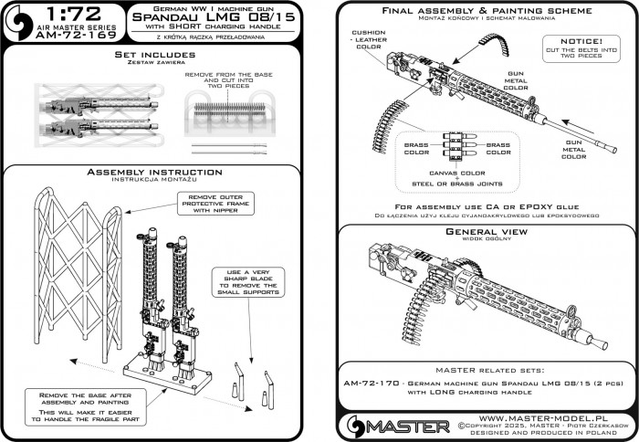Master AM-72-169 Niemiecki km z okresu I w.św. Spandau LMG 08/15 (2 szt.) - z KRÓTKĄ rączką przeładowania - wydruki 3D i mosiężne lufy (1:72)